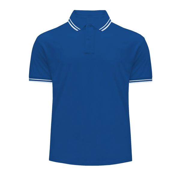 Męska koszulka Polo w kolorze niebieskim z krótkim rękawem i kołnierzykiem wykończonym ozdobnym ściągaczem w białe paski. Elegancki fason polówki dedykowany na pola golfowe, mecze tenisowe, nieoficjanle spotkania towarzyskie.