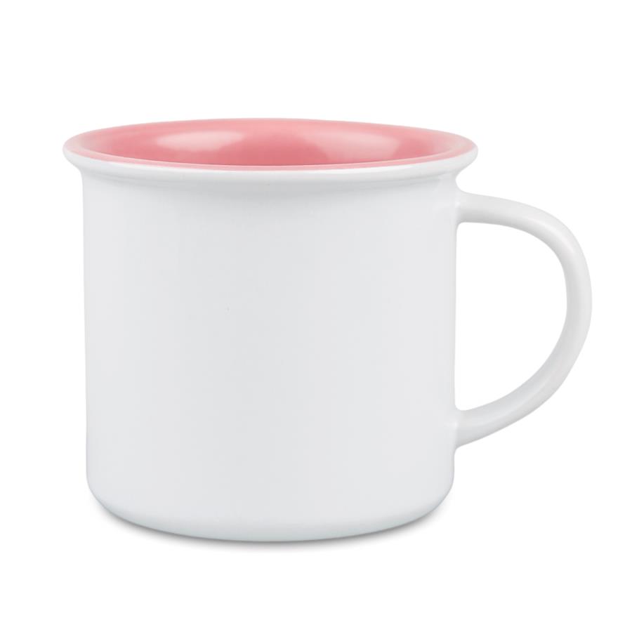 Kubek vintage z różowym wnętrzem przypomina do złudzenia kubek metalowy.