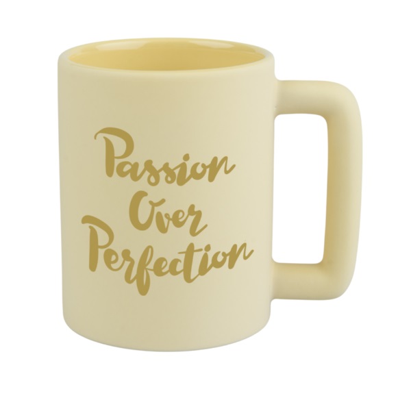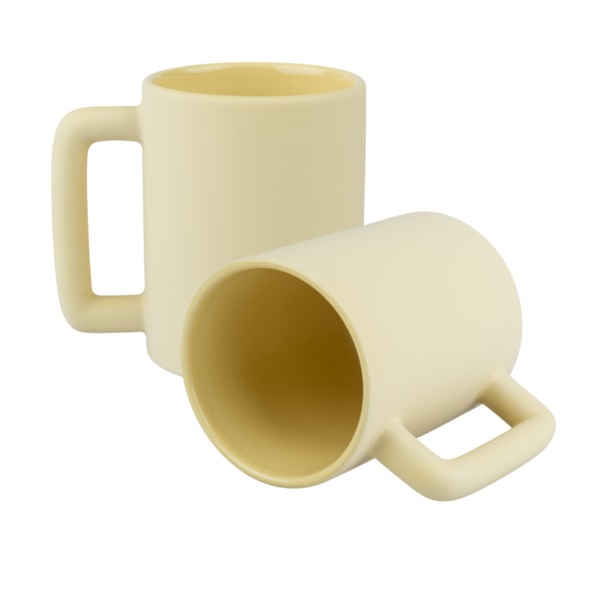 Kubek w podstawowym, najpopularniejszym kształcie walca z dużym, prostokątnym uchwytem.