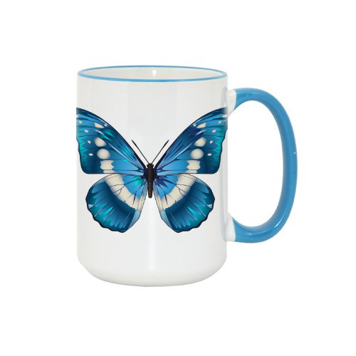 • Błyszczący biały kubek XXL do sublimacji z wygodnym, kolorowym uchem oraz rantem
