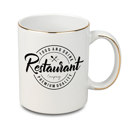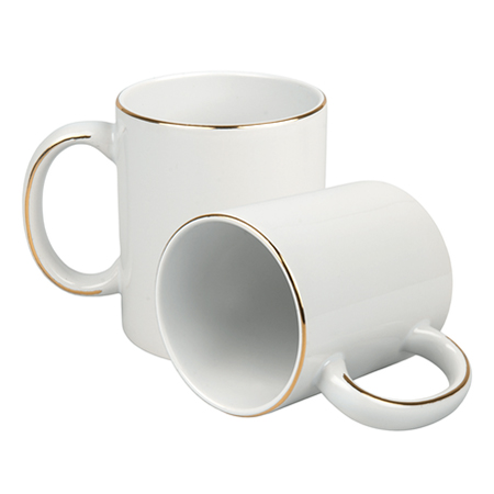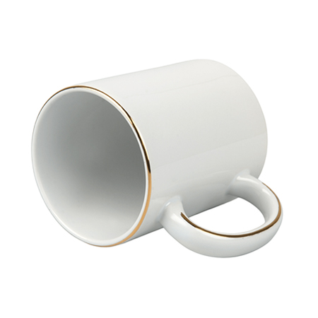 Biały kubek do sublimacji ze złotymi paskami na uszku i krawędzi
