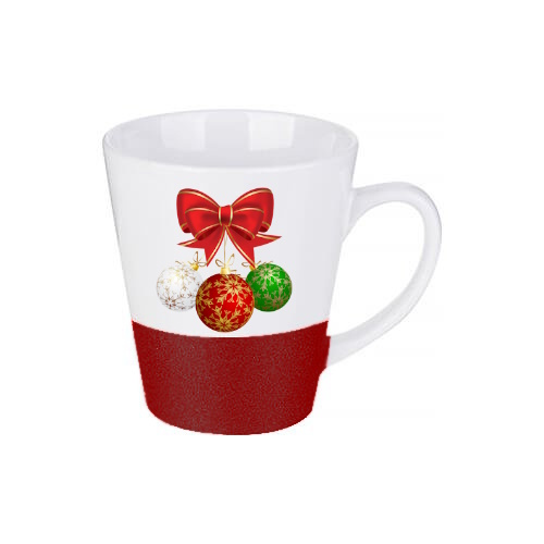 Biały kubek latte z brokatowym, czerwonym paskiem, świetny do wykonywania oryginalnych nadruków