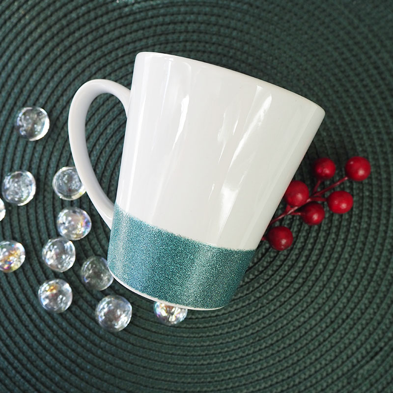 • Biały kubek latte do sublimacji z kolorowym brokatowym paskiem i dużym, wygodnym uchem