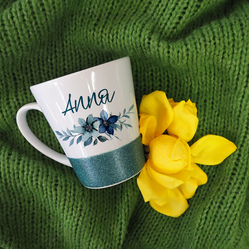 Biały kubek latte z brokatowym niebieskim paskiem, świetny do wykonywania oryginalnych nadruków