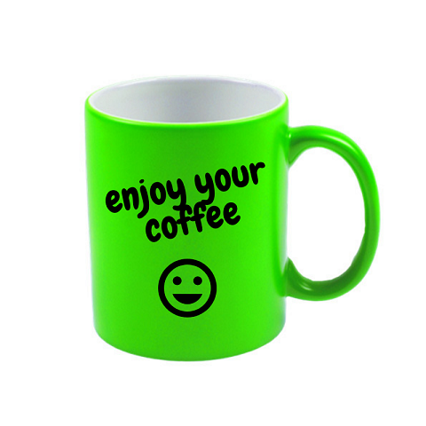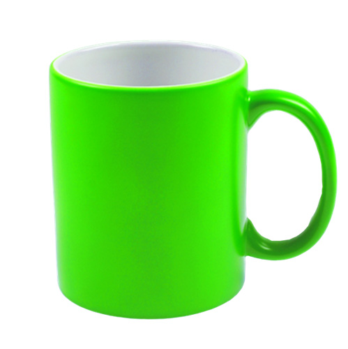 • Błyszczący, zielony neonowy kubek do sublimacji z białym wnętrzem oraz wygodnym, kolorowym uchem