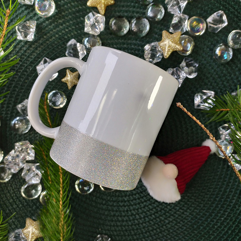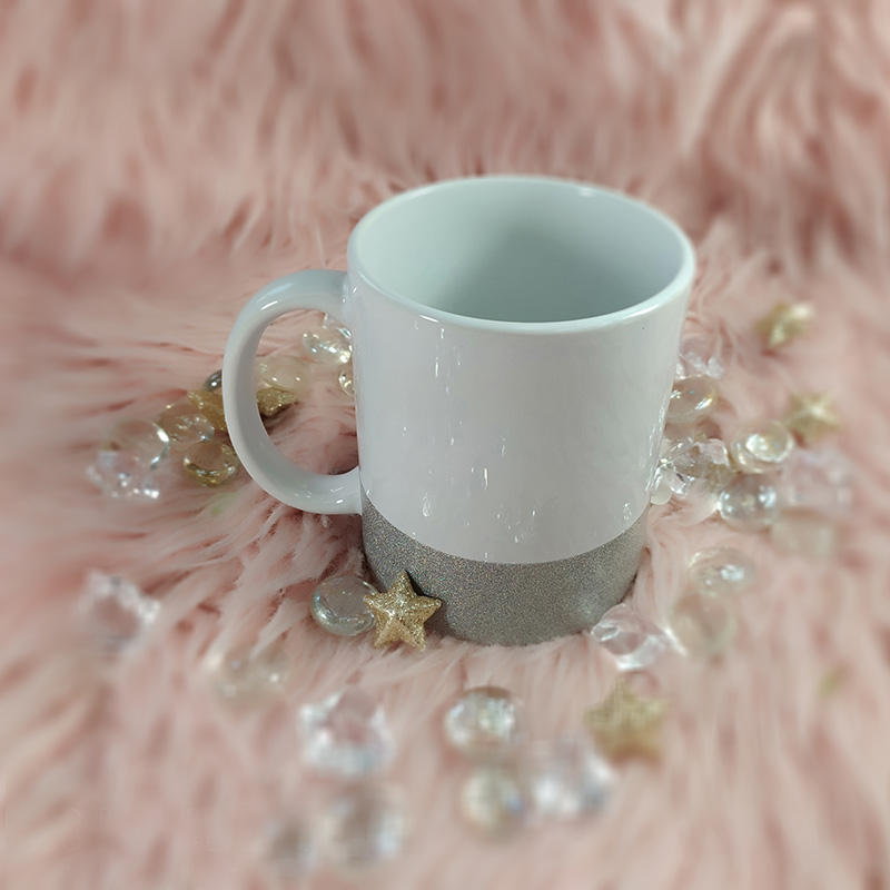 • Biały Kubek do sublimacji z kolorowym brokatowym paskiem i dużym, wygodnym uchem