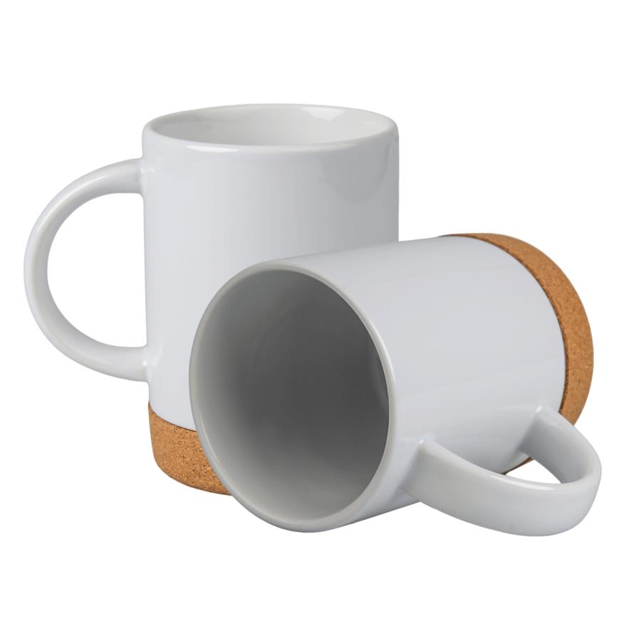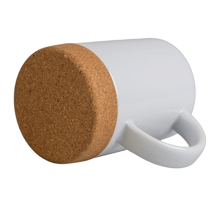 • Błyszczący biały kubek do sublimacji z dużym, wygodnym uchem i podstawką korkową