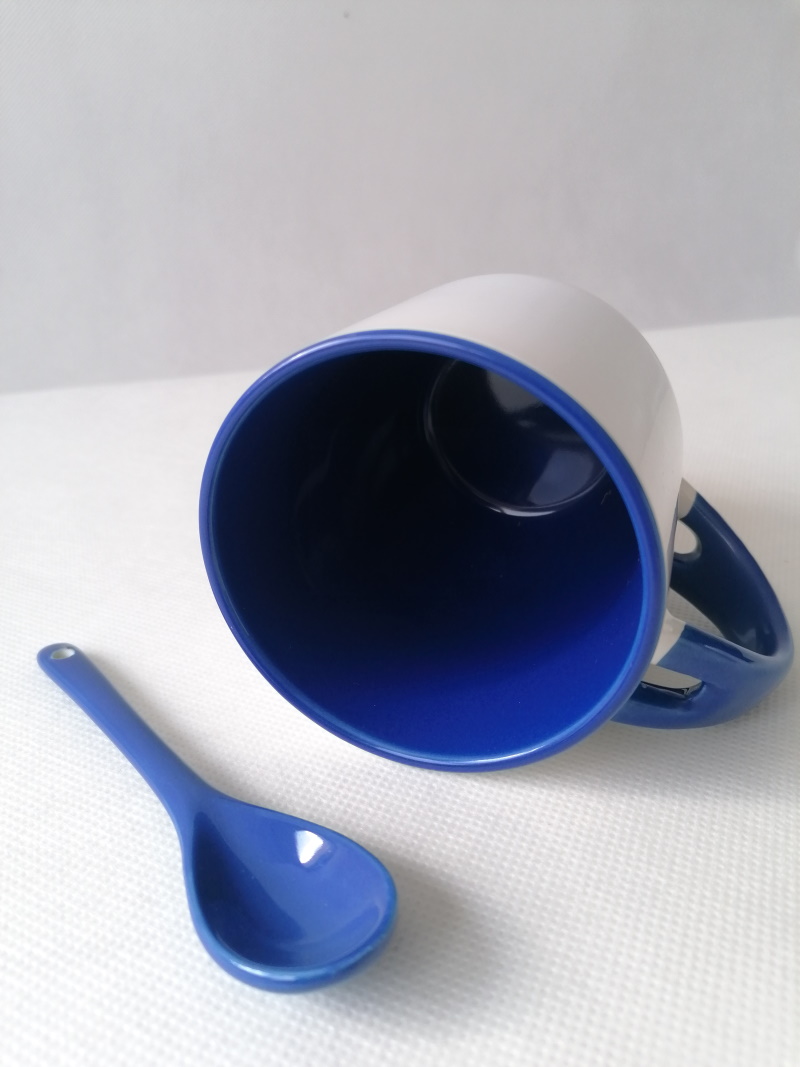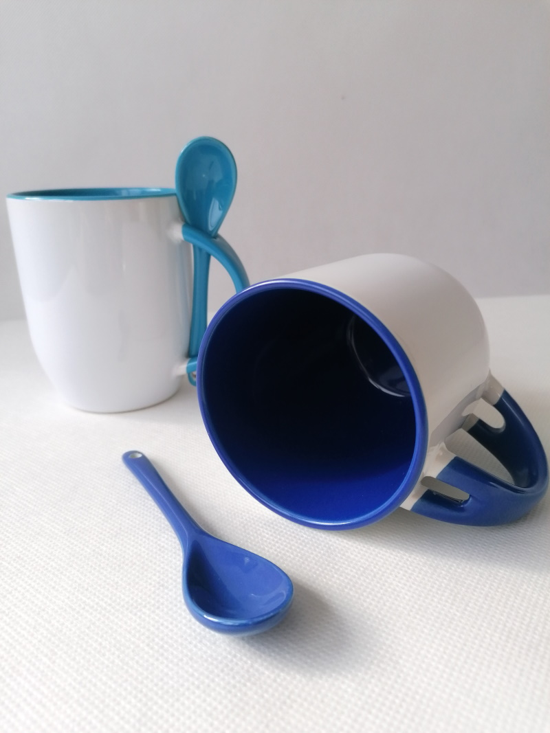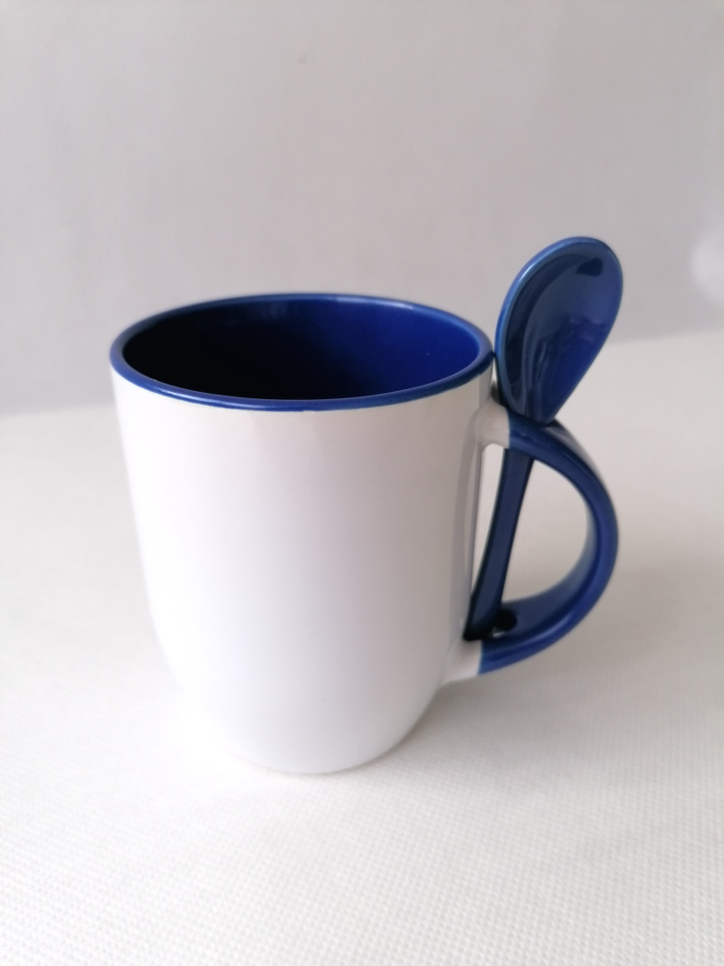 • Błyszczący biały kubek do sublimacji z łyżeczką i wygodnym, kolorowym uchem oraz wnętrzem