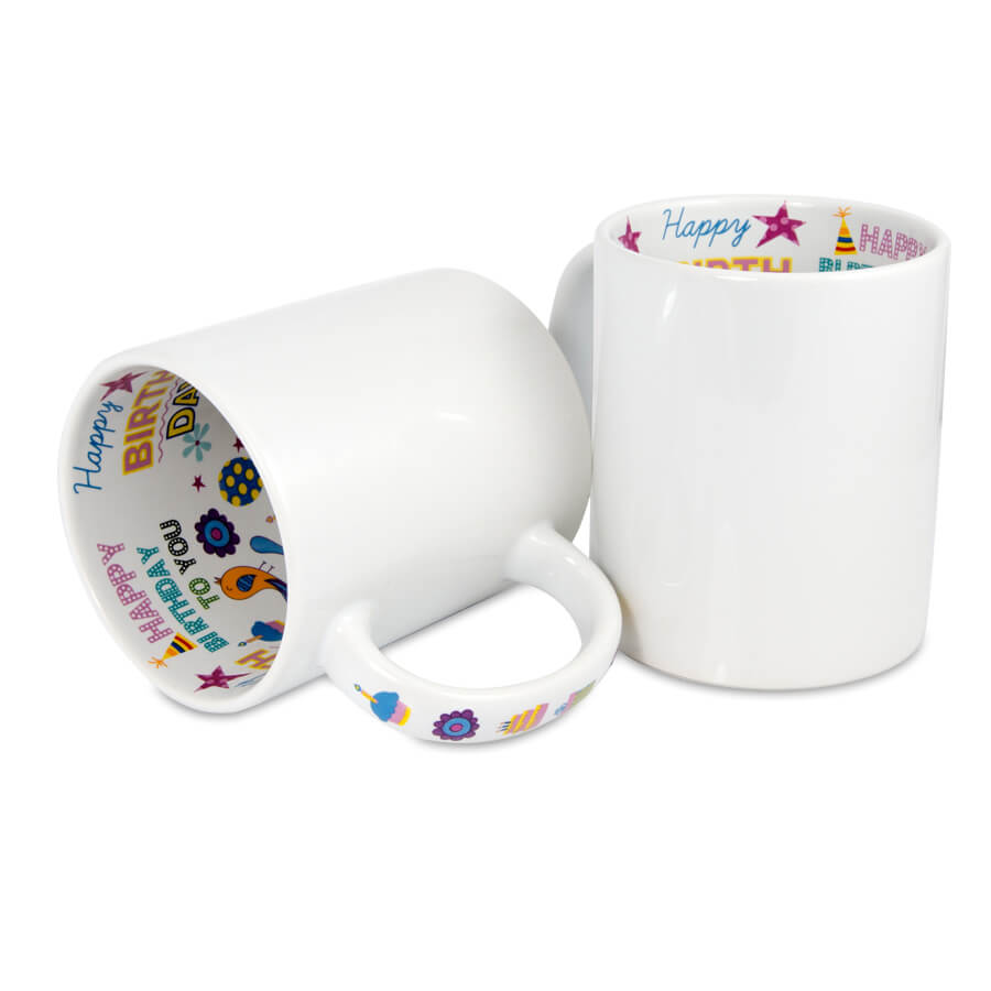 • Klasyczny, biały kubek do sublimacji z nadrukiem wewnątrz i dużym, wygodnym uchem