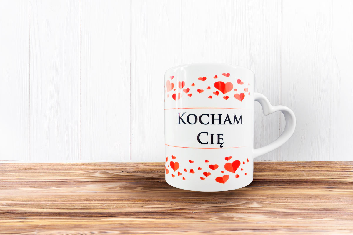 • Błyszczący biały kubek do sublimacji z kolorowym uszkiem w kształcie serca