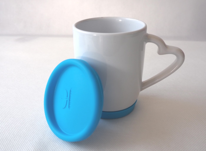 Biały kubek do sublimacji z sercem w uchwycie - z niebieską silikonową pokrywką i podstawką