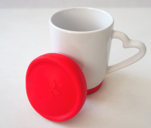 Biały kubek do sublimacji z sercem w uchwycie - z czerwoną silikonową pokrywką i podstawką