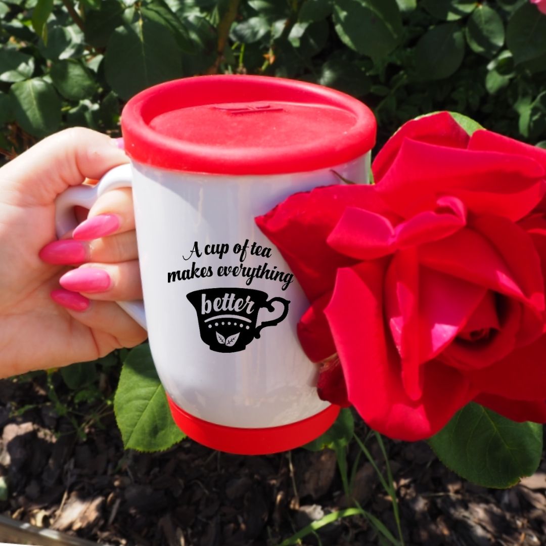 • Dzięki silikonowym dodatkom kubek stoi stabilnie nawet na gładkiej powierzchni, zaś przykrywka sprawia, iż z powodzeniem zastąpi on zaparzacz do ulubionej herbaty. Niosąc gorący napój w zamkniętym kubku możemy być spokojni, że nie rozleje się na boki