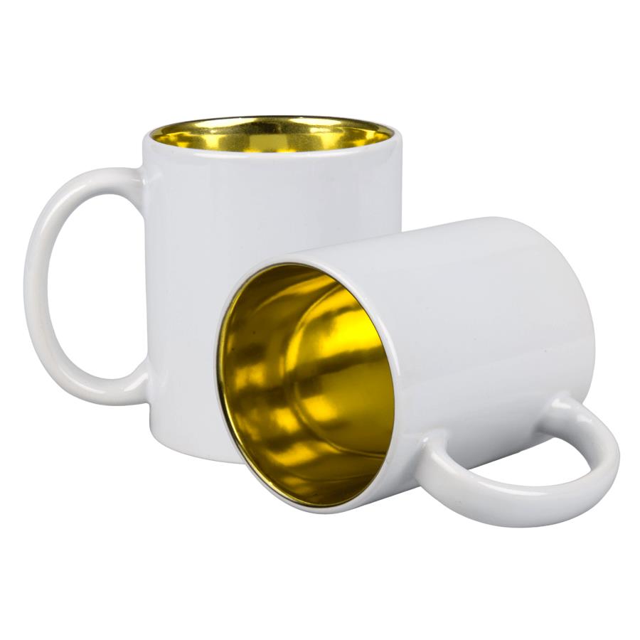 • Błyszczący biały kubek do sublimacji z dużym, wygodnym uchem oraz kolorowym, metalicznym środkiem