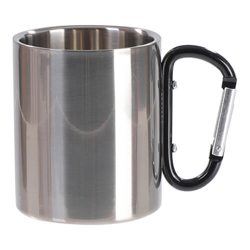 • Metalowy, srebrny kubek do sublimacji z czarnym uchwytem typu karabińczyk do przypinania