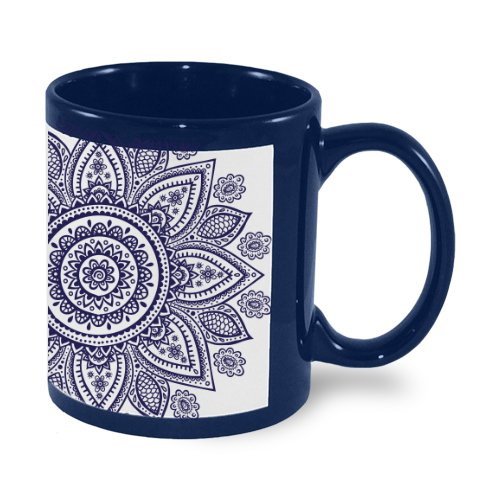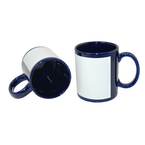 • Błyszczący, granatowy kubek do sublimacji z kolorowym wnętrzem i uchem oraz białym polem pod nadruk