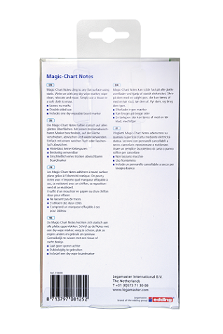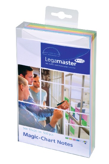 Elektrostatyczny notes Magic Chart Notes o wymiarach 20 x 10 cm w kolorach białym, zielonym, różowym, niebieskim i żółtym. Ilość karteczek w bloczku: 500 (po 100 kartek z każdego koloru). Bloczek kartek jest zapakowany w opakowanie z uchwytem typu eurodziurka; w zestawie także suchościeralny czarny marker TZ 111
