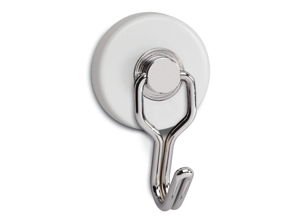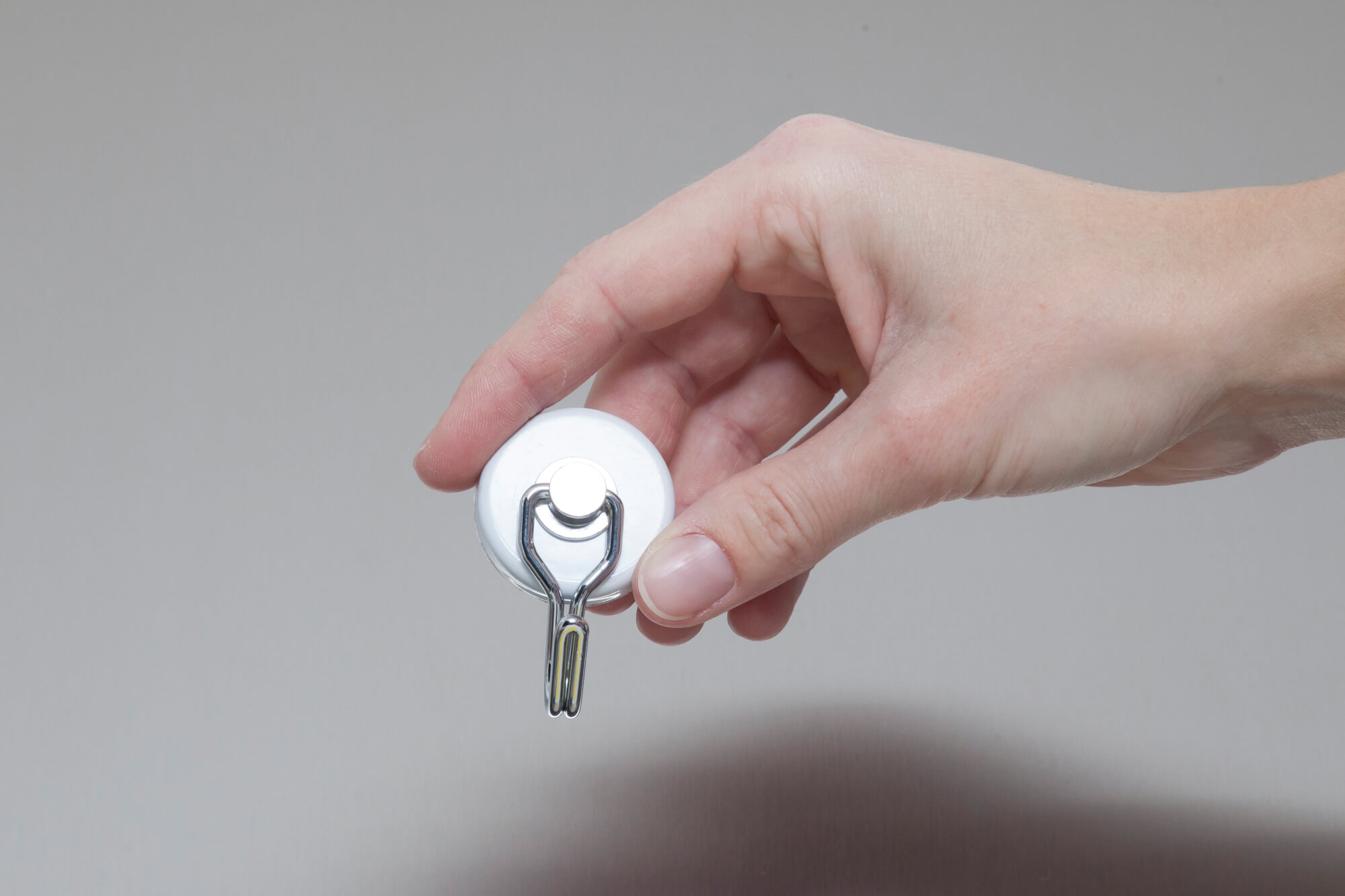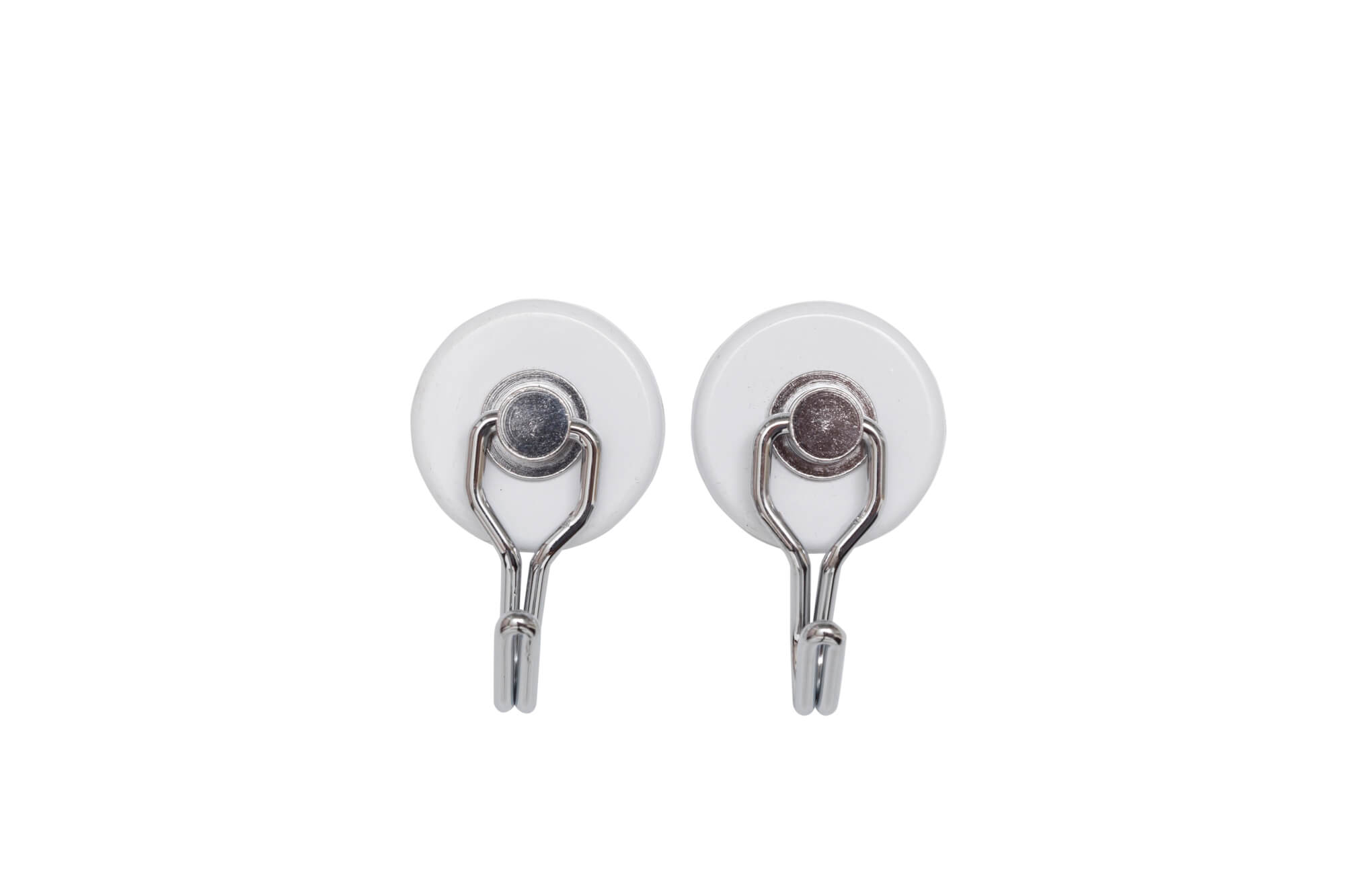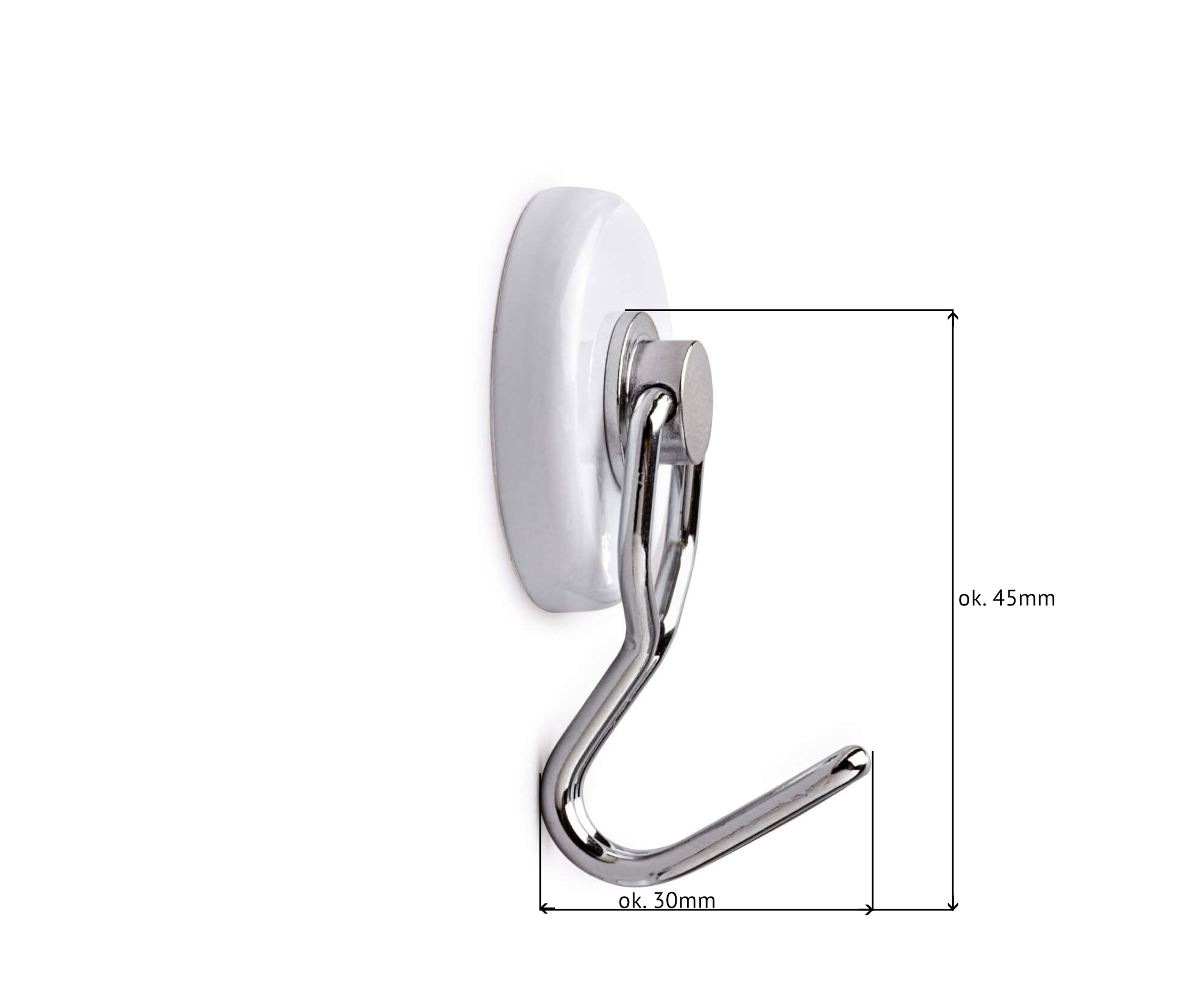 • Silne magnesy z haczykiem w białej obudowie o średnicy 35 mm; haczyk srebrny, bezpiecznie zaokrąglony