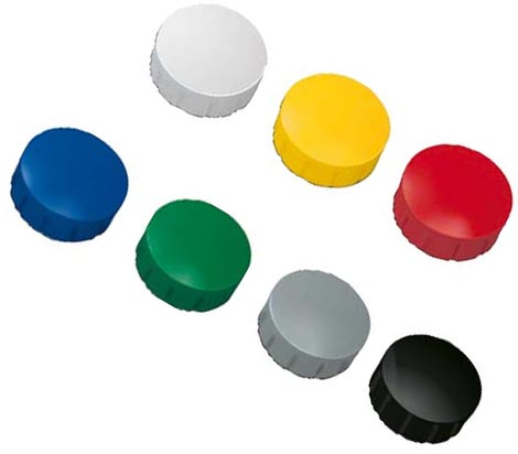 Ogrągłe magnesy w kilu kolorach: (2 x żółty, czerwony i niebieski, 1 x biały, zielony, szary i czarny) o średnicy 15 mm i grubości 7 mm