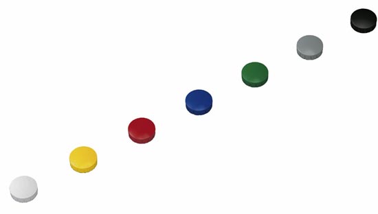 Ogrągłe magnesy w kilu kolorach: (2 x żółty, czerwony i niebieski, 1 x biały, zielony, szary i czarny) o średnicy 24 mm i grubości 8 mm