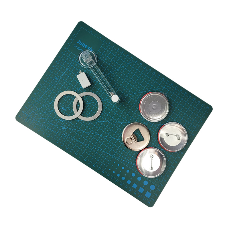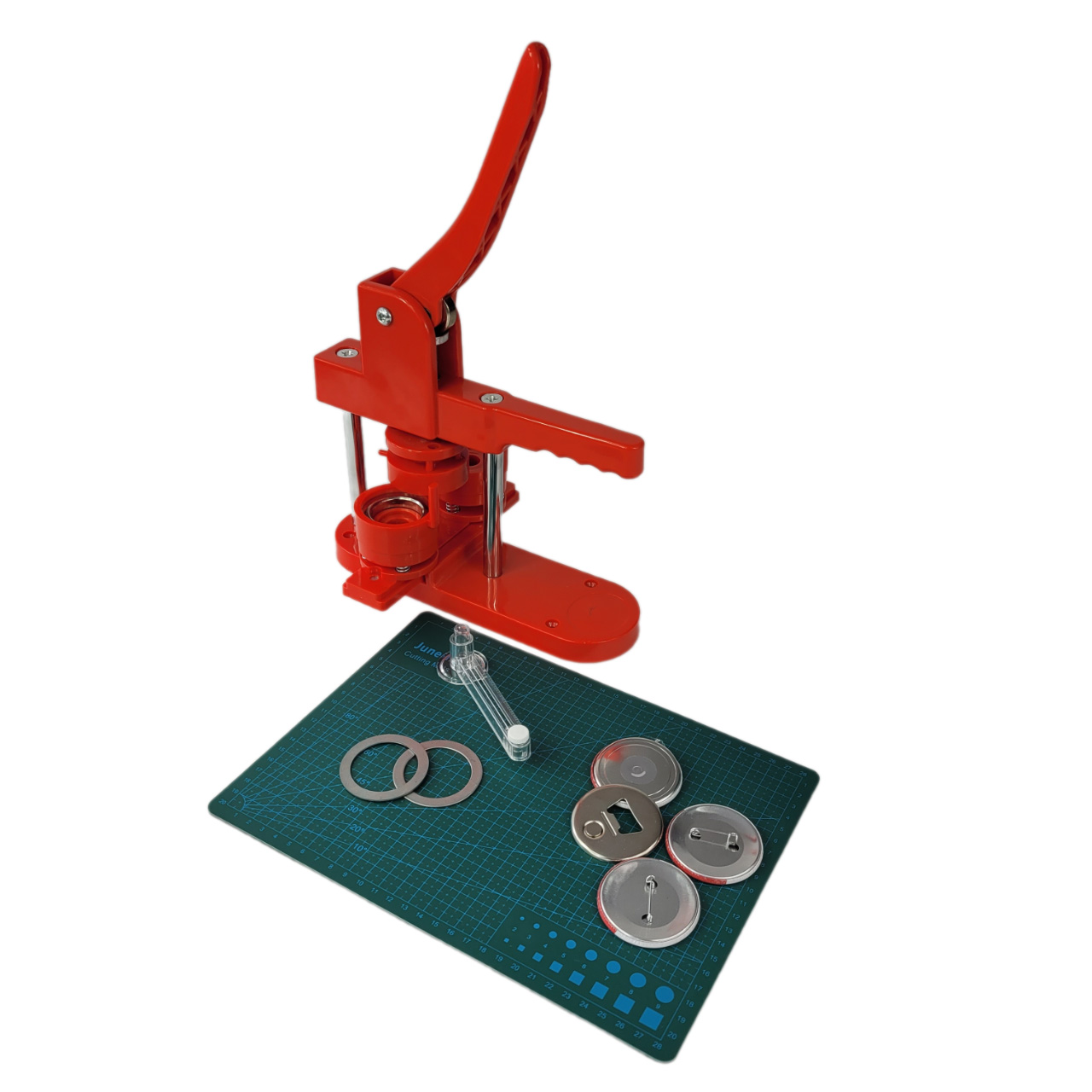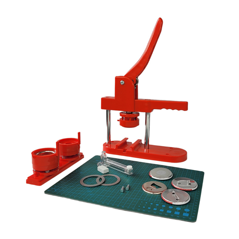 - Urządzenie do produkcji odznak DIY wraz z załączonymi akcesoriami tworzy kompletny zestaw startowy, umożliwiający rozpoczęcie produkcji znaczków.