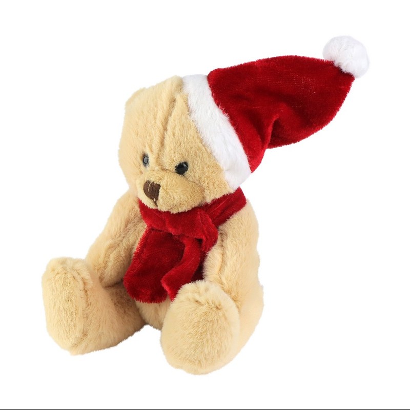• Pluszowy miś w miodowym kolorze ma wysokość 12cm. Maskotka ubrana w welurowy czerwony szaliczek i czerwono-białą czapeczkę z pomponem.