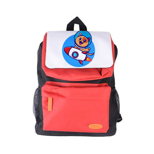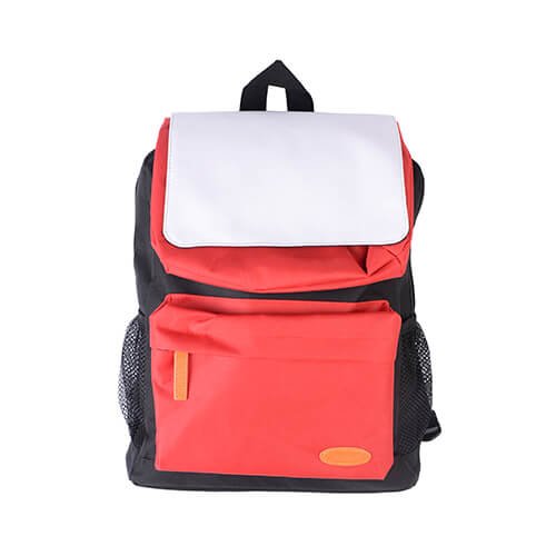 Czerwony plecak szkolny z czarnymi kieszeniami i białą, odpinaną klapą do nadruku sublimacyjnego