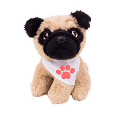 Maskotka - pluszowy pies mops z białą chustą do sublimacji ma wysokość: 14 cm, wymiary chustki: 5 x 2 cm.