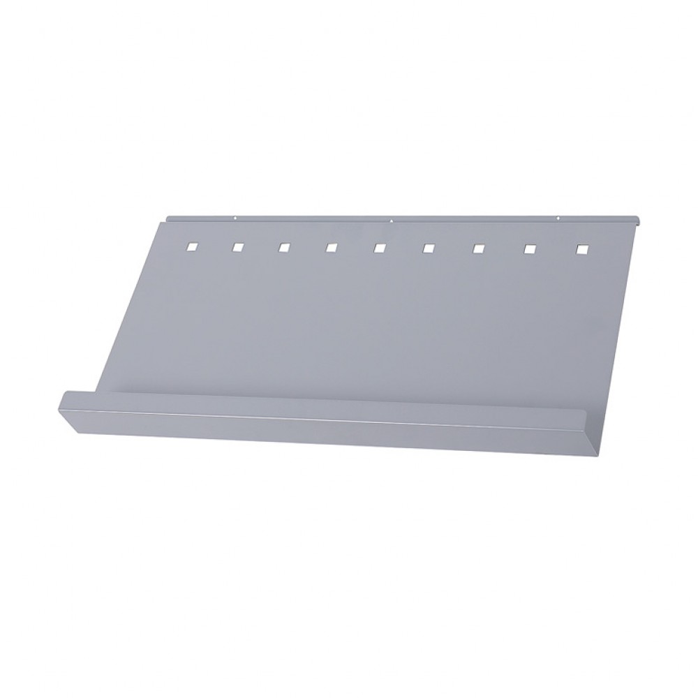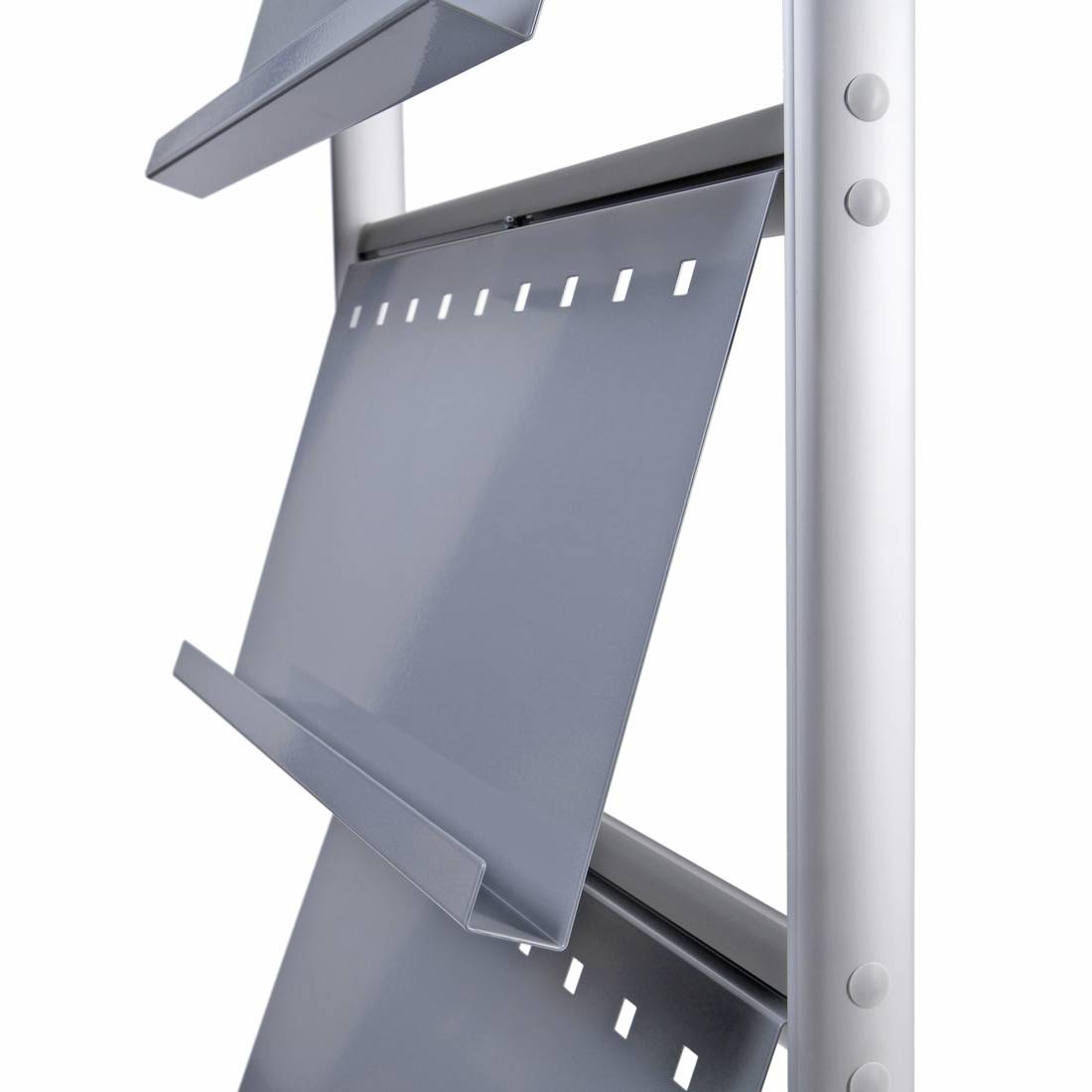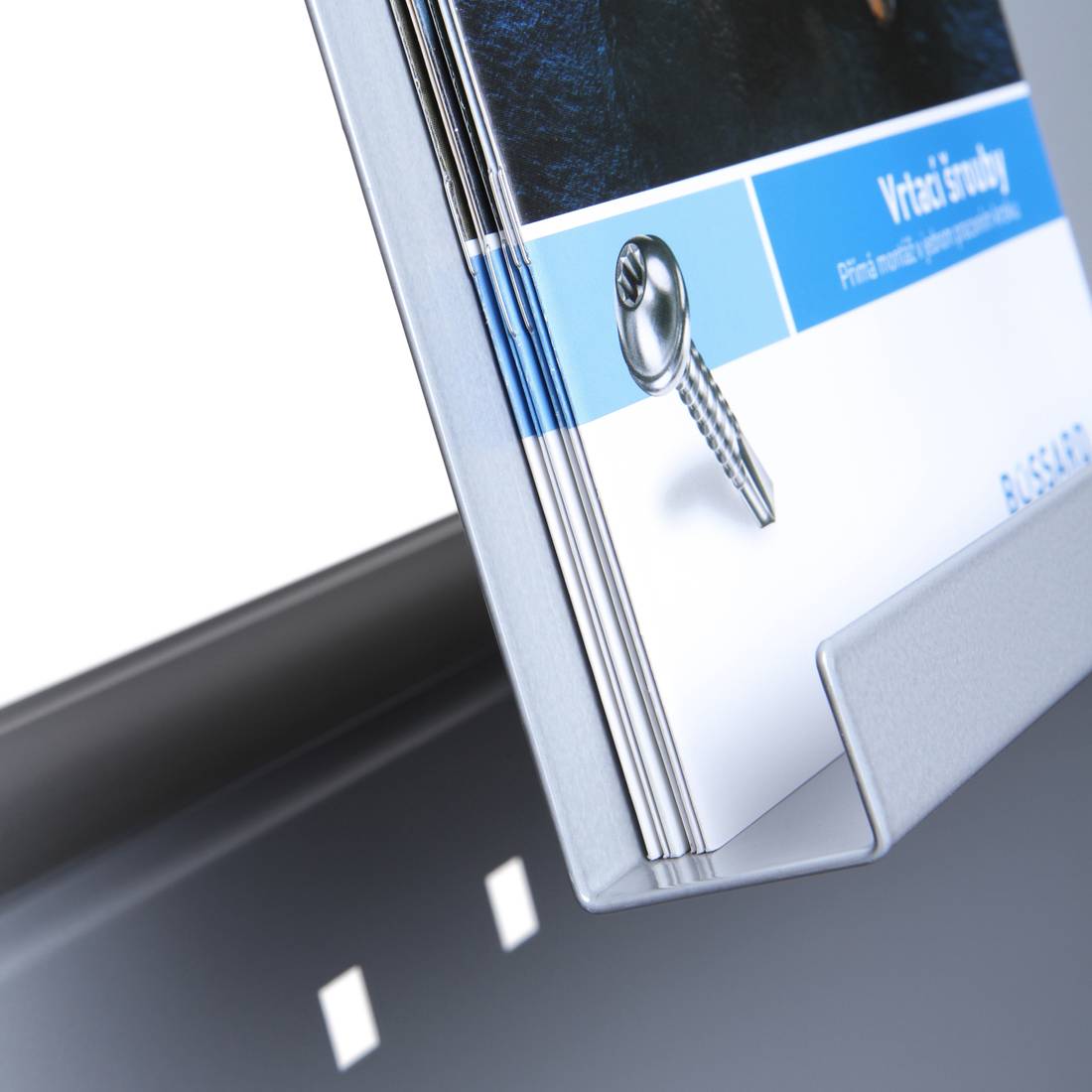 • Szare półeczki do zamocowania na ekspozytorze za pomocą śrub są przystosowane do prezentacji materiałów w formacie A4 (210 x 297 mm)