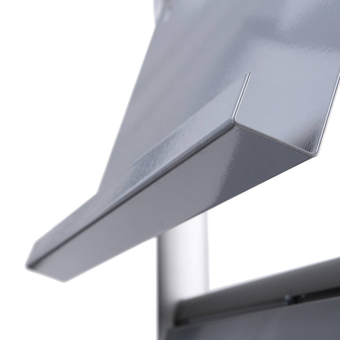 • Metalowe szare półki do stojącego prezentera na ulotki osiągają wymiary 64 x 31 x 4 cm i wagę 3,57 kg
