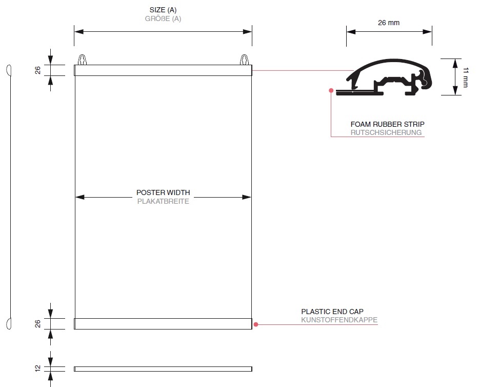 Plakatowe listwy zaciskowe służą do profesjonalnej prezentacji plansz, obrazów, cenników, instrukcji itp. Dzięki przesuwanym haczykom w górnym profilu aluminiowe szyny łatwo przymocowuje się np. do sufitu za pomocą linek. Zatrzaskowe listwy na plakaty są powleczone gumą, która zapobiega wyślizgiwaniu się zawartości.