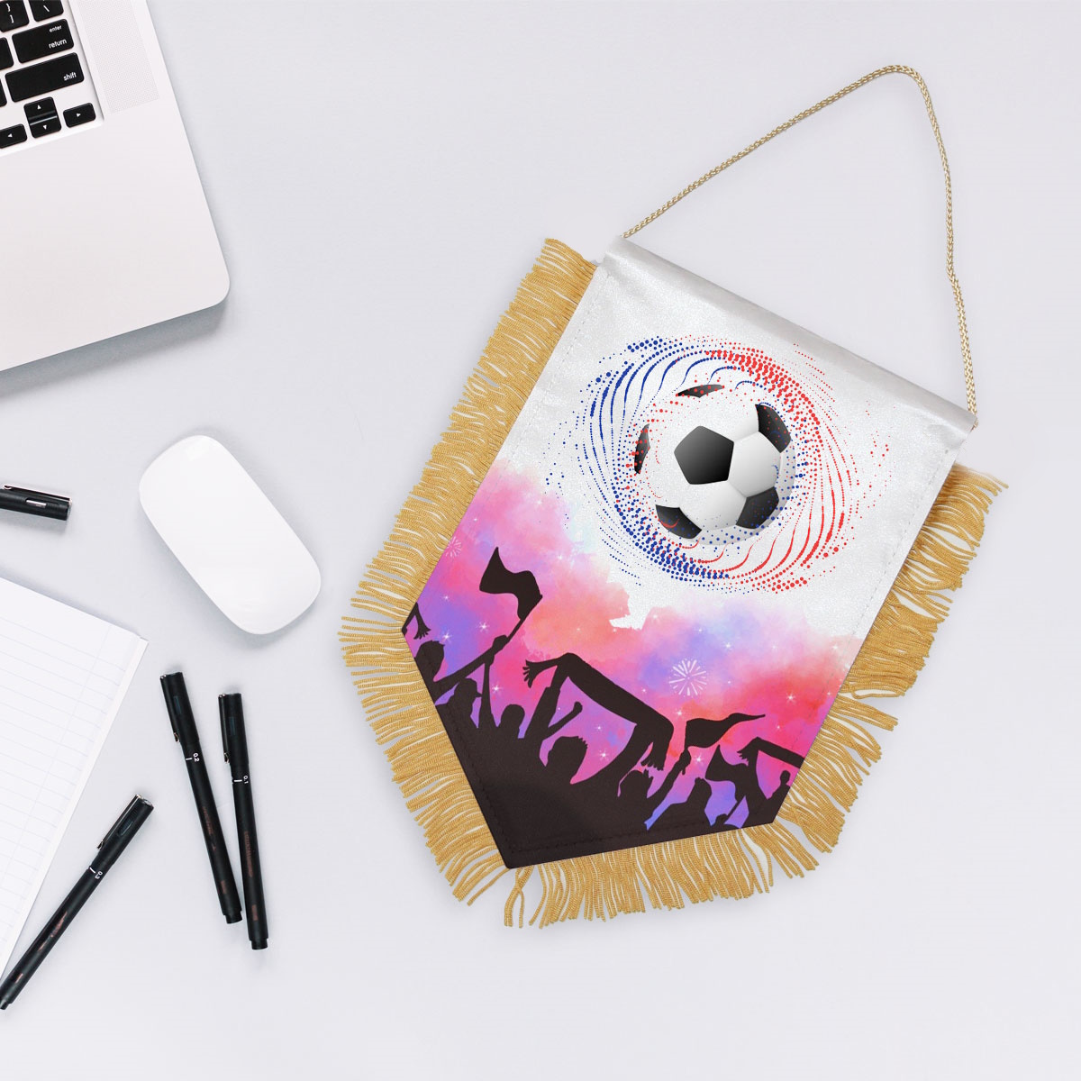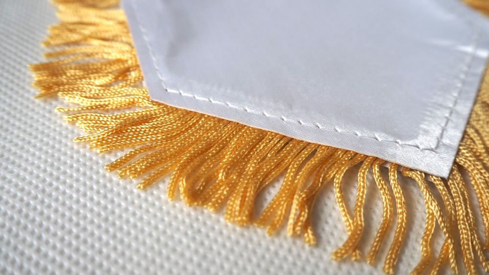 • Wykonany z poliestru proporzec do nadruku jest biały i posiada ozdobne frędzle oraz sznurek do zawieszenia