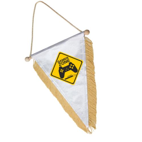 • Wykonany z poliestru proporzec do nadruku jest biały i posiada ozdobne frędzle oraz sznurek do zawieszenia