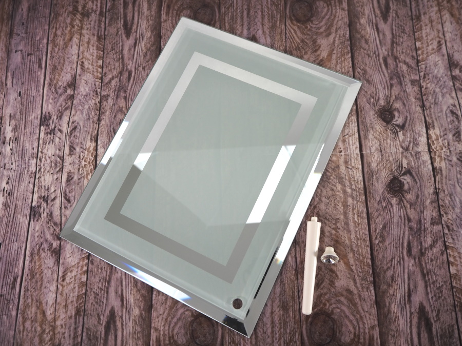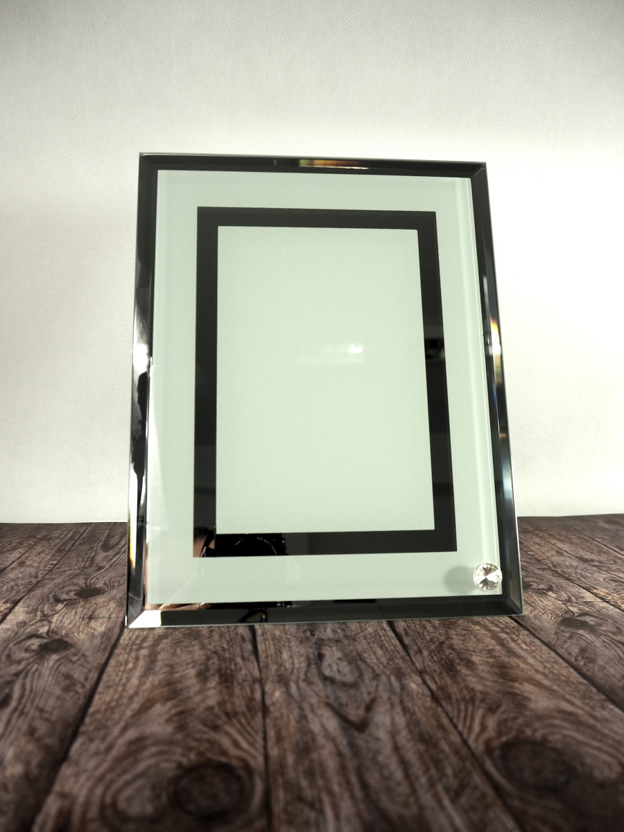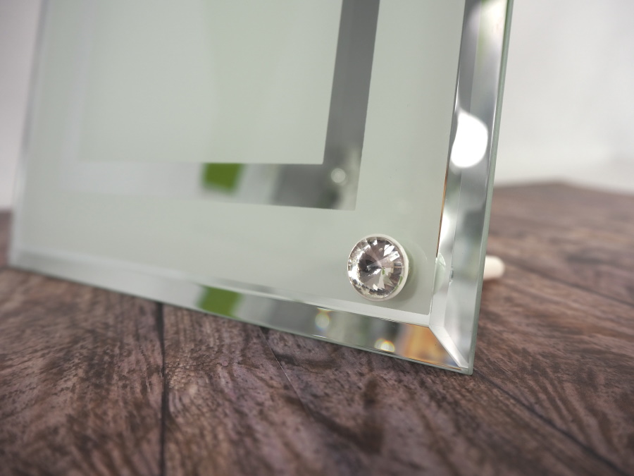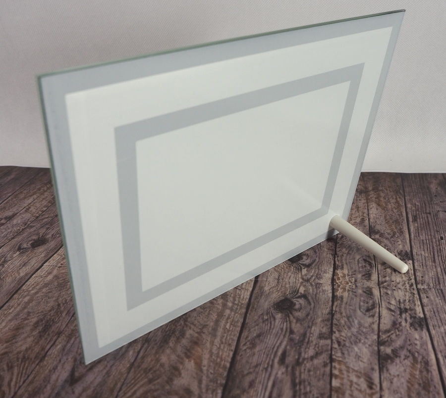 • Szklana ramka do sublimacji posiada w zestawie białą, plastikową nóżkę z kryształową główką