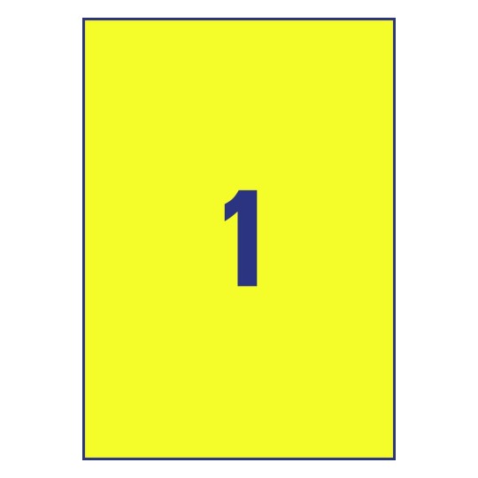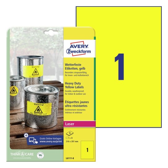 Trwałe, żółte folie samoprzylepne Heavy Duty są sprzedawane w opakowaniach po 20 arkuszy w formacie A4 (21 x 29,7 cm). Każdy arkusz to 1 żółta naklejka z poliestru