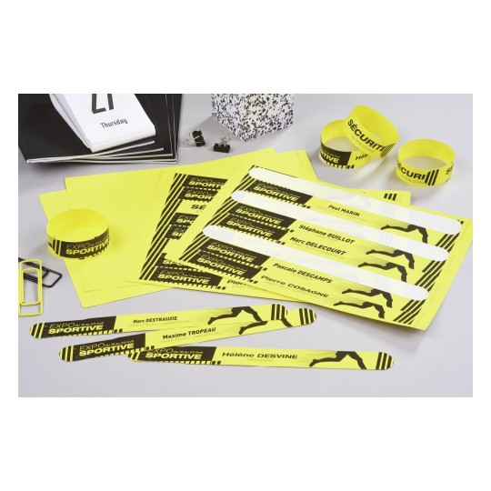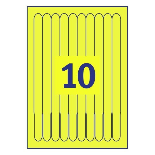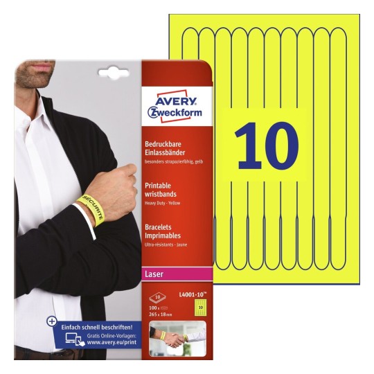 Trwałe, żółte opaski są sprzedawane w opakowaniach po 10 arkuszy w formacie A4 (21 x 29,7 cm). Każdy arkusz to 10 żółtych opasek z poliestru, wymiary etykiety: 265 x 18 mm