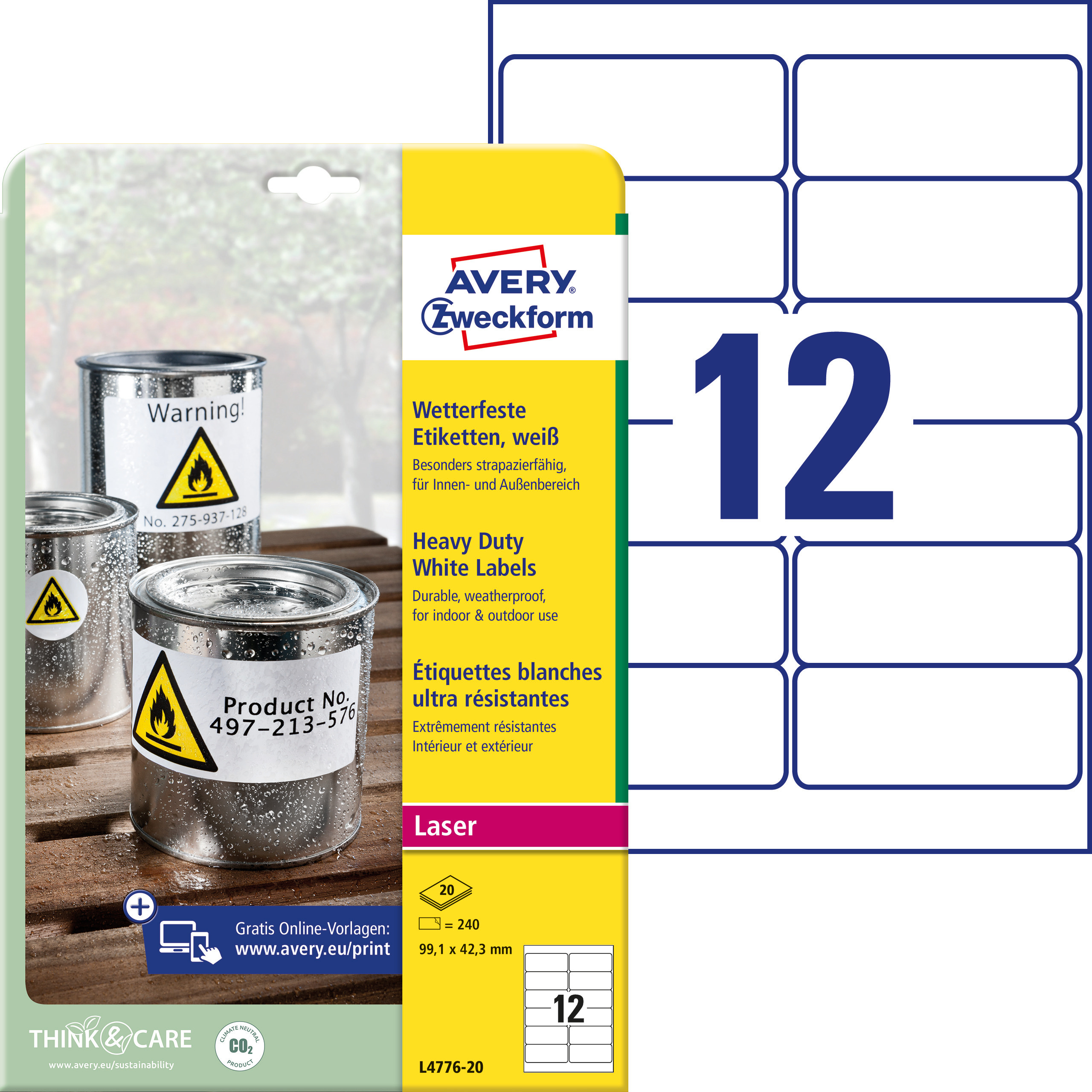 Trwałe etykiety Heavy Duty są sprzedawane w opakowaniach po 20 arkuszy w formacie A4 (21 x 29,7 cm). Każdy arkusz to 12 białych naklejek z poliestru, wymiary etykiety: 99,1 x 42,3 mm