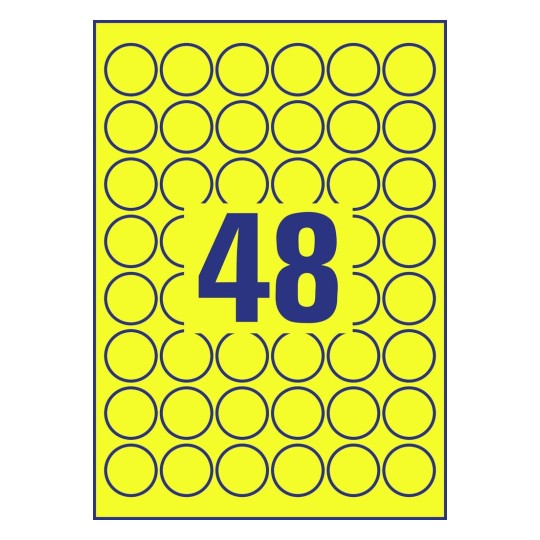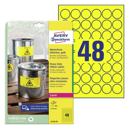 Trwałe, żółte etykiety Heavy Duty są sprzedawane w opakowaniach po 20 arkuszy w formacie A4 (21 x 29,7 cm). Każdy arkusz to 48 żółtych okrągłych naklejek z poliestru, wymiary etykiety: fi 30 mm