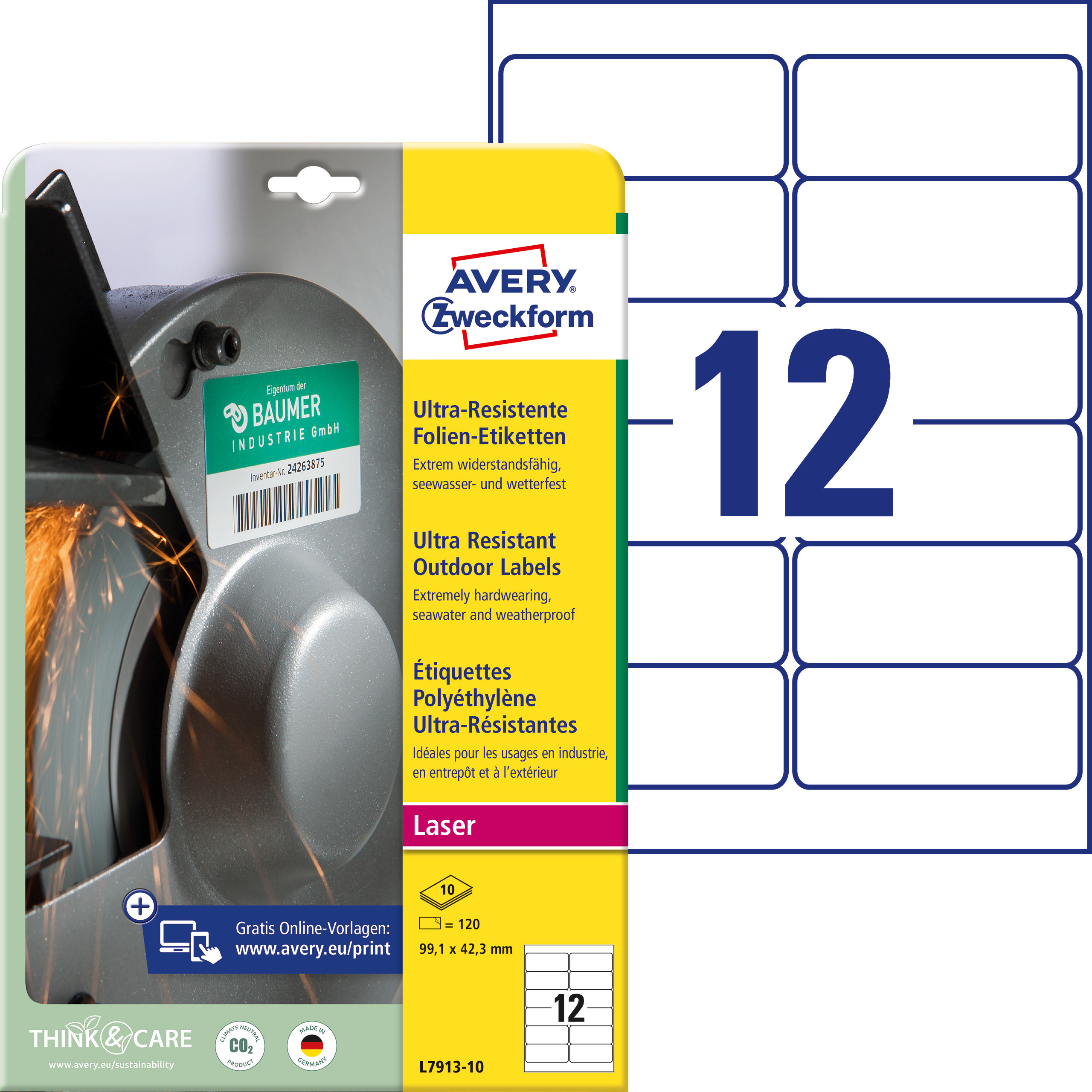 Trwałe etykiety Ultra Resistant są sprzedawane w opakowaniach po 10 arkuszy w formacie A4 (21 x 29,7 cm). Każdy arkusz to 12 białych naklejek z polietylenu, wymiary etykiety: 99,1 x 42,3 mm