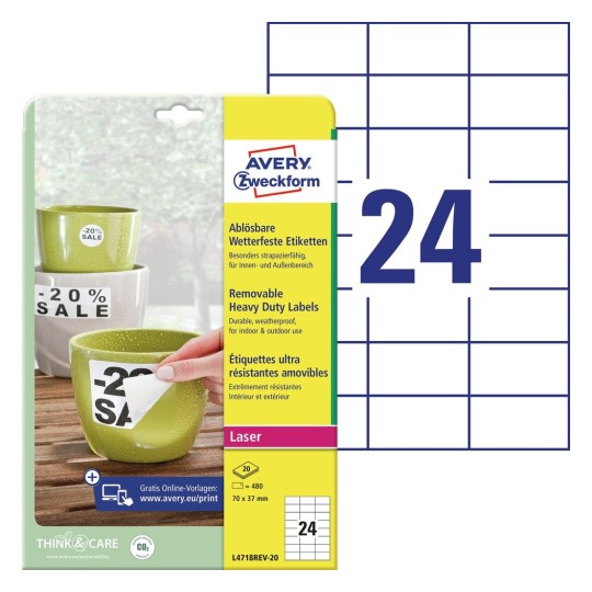 Trwałe etykiety wielokrotnego odklejania Heavy Duty są sprzedawane w opakowaniach po 20 arkuszy w formacie A4 (21 x 29,7 cm). Każdy arkusz to 24 białe naklejki z poliestru, wymiary etykiety: 70 x 37 mm