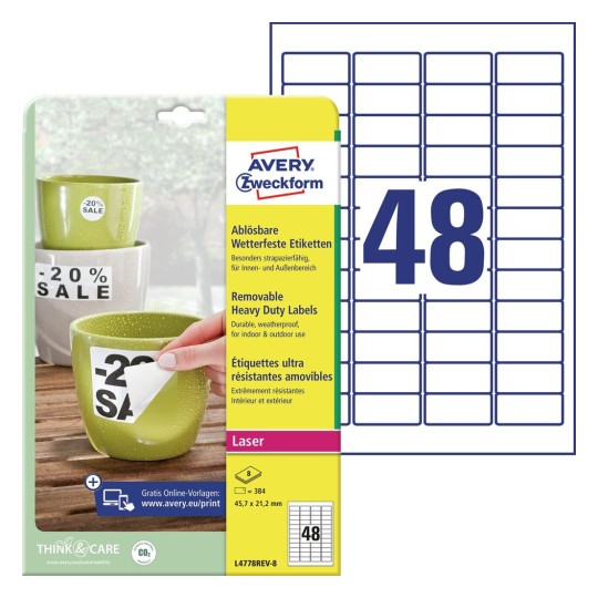 Trwałe etykiety wielokrotnego odklejania Heavy Duty są sprzedawane w opakowaniach po 20 arkuszy w formacie A4 (21 x 29,7 cm). Każdy arkusz to 48 białych naklejek z poliestru, wymiary etykiety: 45,7 x 21,2 mm