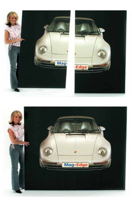 • Zaletą Magedge jest jego elastyczność i niewielka grubość, która pozwala płynnie łączyć cienkie banery ze sobą, a co więcej umożliwia zwijanie już połaczonych banerów w ciasny rulon (np. w celu przeniesienia w inne miejsce) bez potrzeby rozłączania