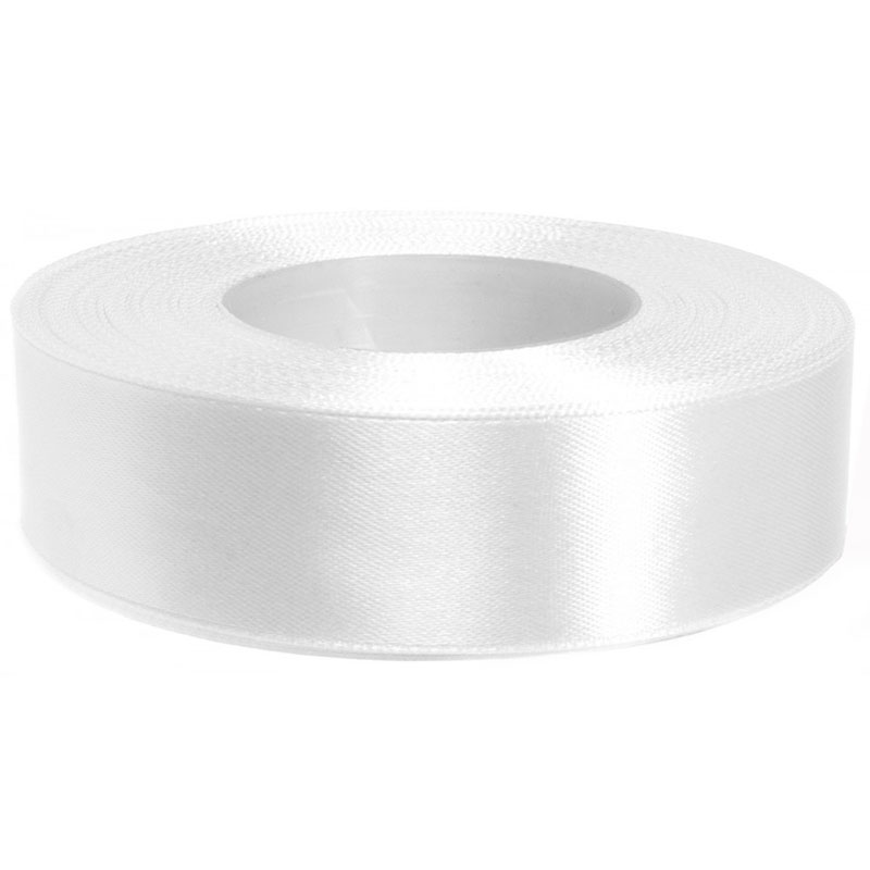 Satynowa wstążka w kolorze białym do nadruku w drukarce termotransferowej TSC TE200. Biała taśma satynowa o szerokości 2,5 centymetra jest nawinięta na rolkę o długości 50 metrów.