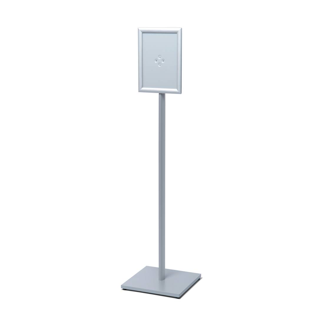 • Podłogowy srebrny stojak składa się z zatrzaskowej ramki osadzonej na aluminiowej, anodowanej na srebrno nodze; całość oparta na stabilnej podstawie o boku 33 cm