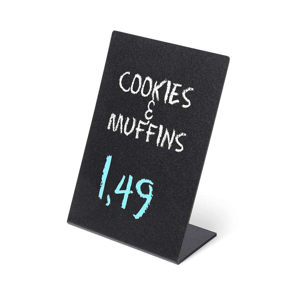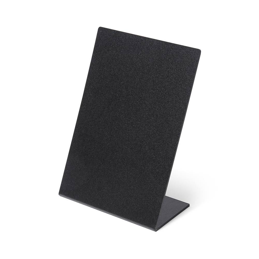 • Stojąca tabliczka kredowa w kształcie litery L cechuje się zgrabną, lekką i stabilną konstrukcją