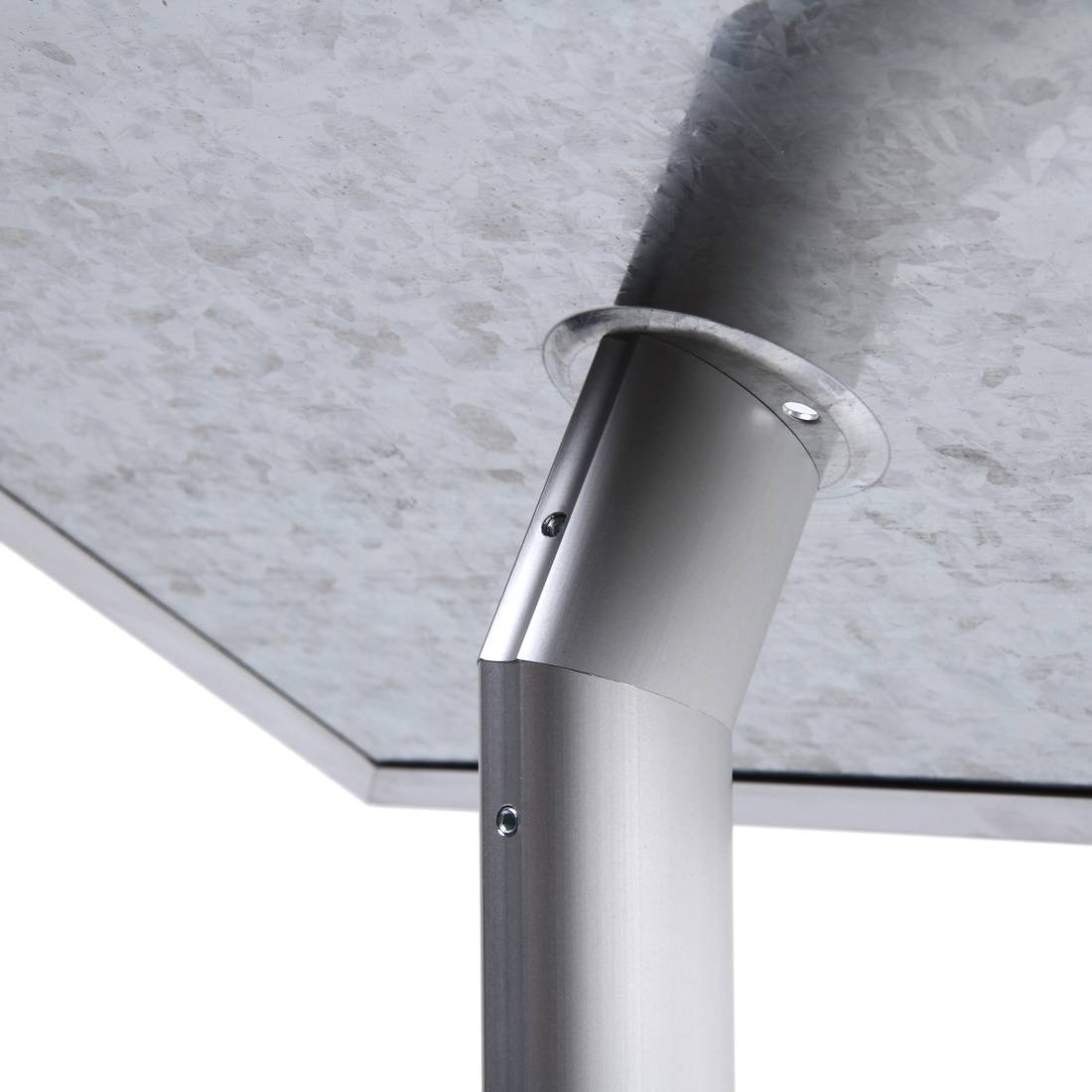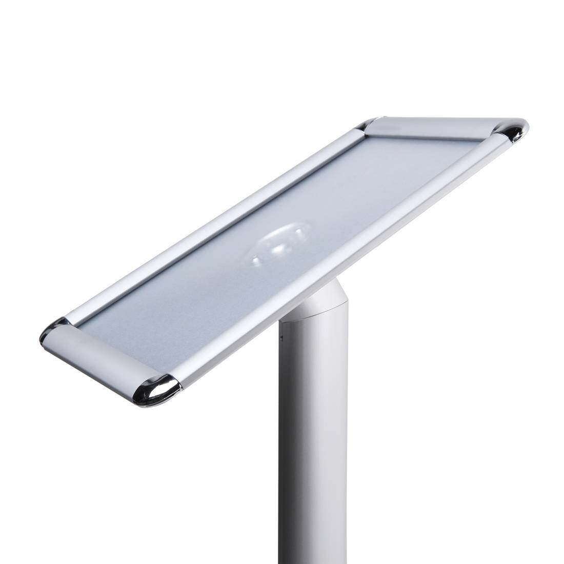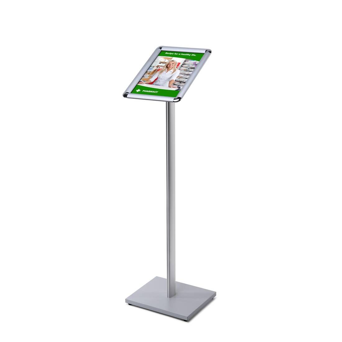 • Wolnostojący stand reklamowy składa się z zatrzaskowej ramki na menu w formacie A4 (210 x 297 mm) oraz aluminiowej anodowanej nogi, osadzonej na podstawie z czterema gumowymi nóżkami