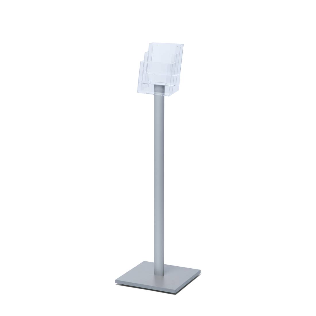 • Pojemnik na ulotki osadzony na srebrnej aluminiowej nodze; kieszenie przezroczyste, akrylowe