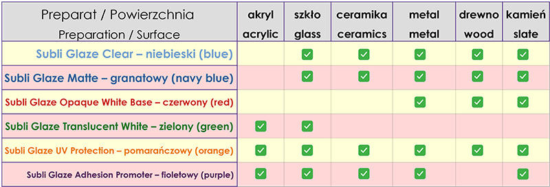Zobacz tabelę zastosowań preperatów Subli Glaze.