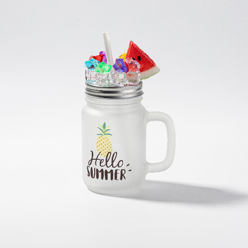 • Szklany szroniony kubek Mason Jar do sublimacji z dużym uchem, metalową zakrętką ozdobioną lodem i arbuzem z otworem na słomkę i słomką