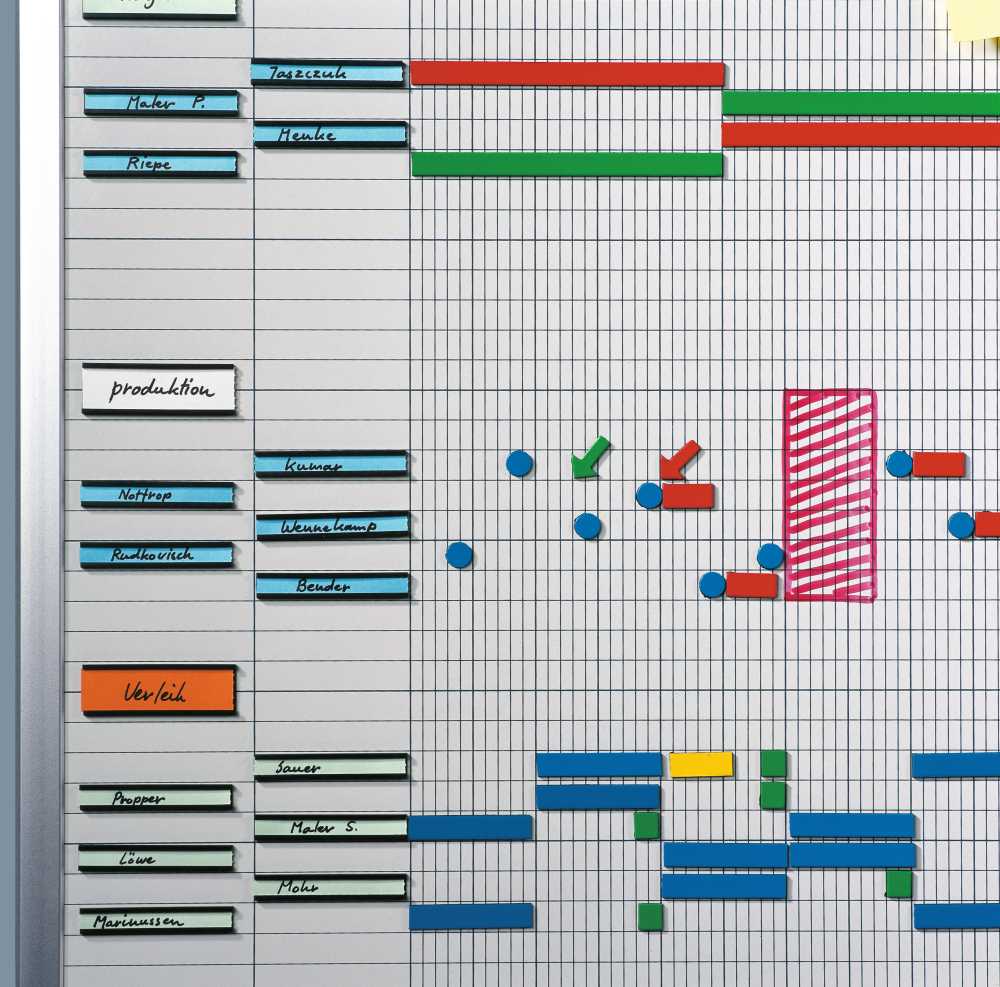 Tablica magnetyczna suchościeralna do planowania tygodnia, miesiąca czy roku służy do sprawnej organizacji pracy w biurze. Na magnetyczne suchościeralne tablice nadrukowana zostaje siatka z polami do rozplanowania każdego dnia. Za pomocą markerów suchościeralnych i akcesoriów magnetycznych na tablicy umieszcza się własne komentarze, ważne informacje i uwagi. Planer na tydzień, miesiąc lub rok do zawieszenia na ścianie ułatwia zarządzanie terminami i projektami oraz zapewnia porządek i przejrzystość.